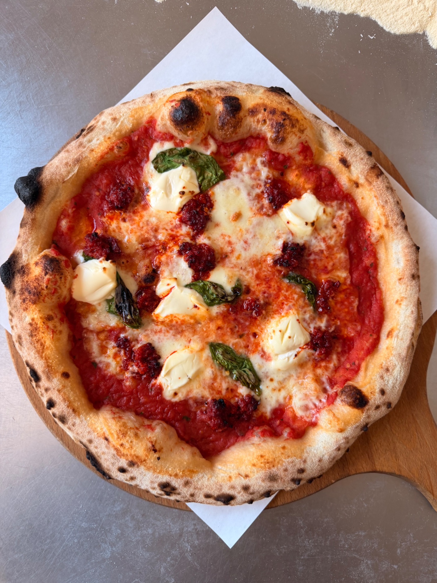 sos pomidorowy, mozzarella, salami spianata piccante, boczek,
